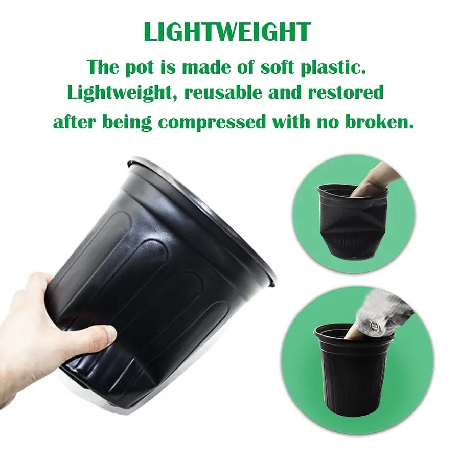 MATERIAL1 gallon nursery pots soft thin plastic,lightweight, reusable and is not easy to deform and get damaged .And the top raised rim make they are easy to handle and to stack.