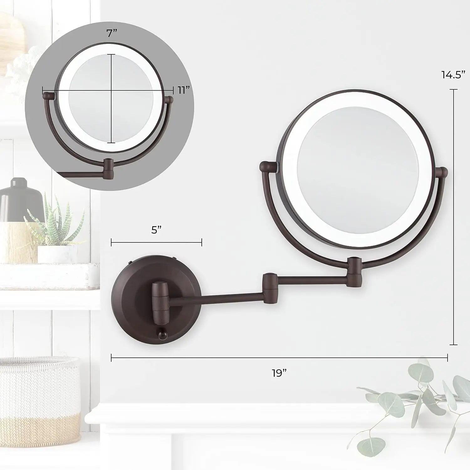 - GEOMETRY & SPECS - 11 inches wide by 14.5 inches tall by 3 inches deep from wall, 9-inch diameter 2-sided mirror head, 7-inch diameter reflective optical glass mirror surface, 1-inch continuous LED ring light, 12-inch jointed arm extension, 5-inch diameter wall-mount base plate, great & easy to use ON/OFF switch knob