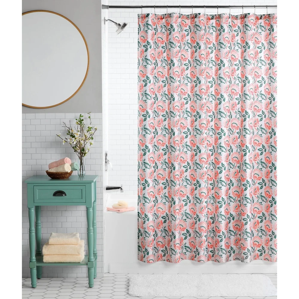 Available in two color options, this fabric shower curtain showcases scrolling Jacobean floral prints with timeless appeal. Each 13-piece bath set includes a shower curtain and shower hooks to complete the look. You can easily keep this 100% polyester fabric shower curtain looking and feeling new by machine washing it in cold water and drying it on a low setting. Pair the shower curtain with your favorite waterproof shower curtain liner (not included).