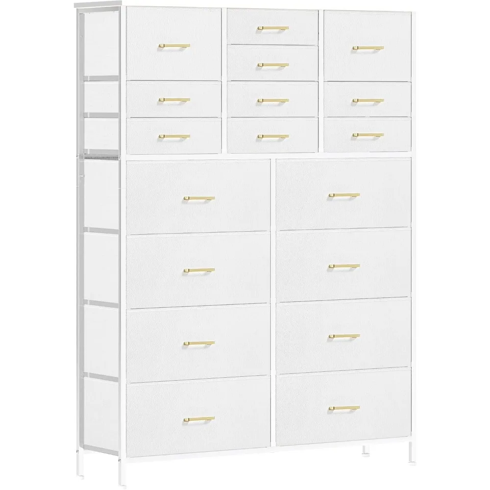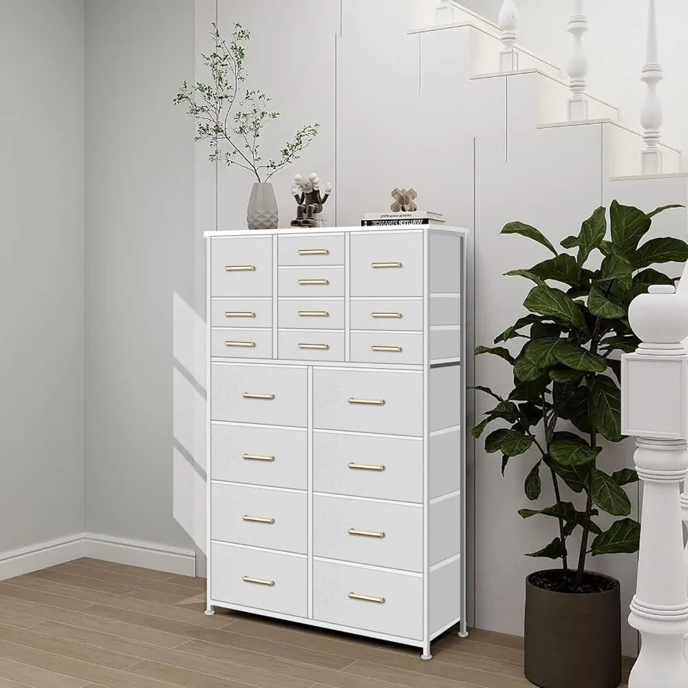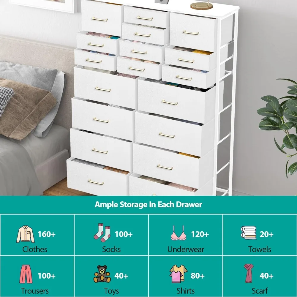 This storage dresser boasts high-quality construction with wear-resistant fabric on all drawer surfaces, ensuring durability and scratch-free storage. Its larger size offers ample storage capacity, making it ideal for organizing your belongings. The dresser features a sturdy steel frame and a durable wooden waterproof countertop, providing strength and stability. The top plate is easy to clean and maintain. The adjustable feet help balance the dresser and protect your floor from scratches. This tall dresser comes with 18 drawers, each capable of holding up to 10 pounds. It includes 8 large drawers for clothes, pants, shirts, jeans, and dresses, 2 middle drawers for neckties, turbans, scarves, and other personal accessories, and 8 small drawers for socks, underwear, and more. The top board can support approximately 44.1 pounds of items. Designed with space efficiency in mind, this dresser measures 37.8 inches in length, 11.8 inches in width, and 57.1 inches in height. Its compact design conserves space while maximizing storage capacity, making it suitable for closets, nurseries, bedrooms, living rooms, laundry rooms, entryways, hallways, and more. Assembly is straightforward, with detailed instructions and an installation video available to guide you through the process. You can have it assembled in just 30 minutes.