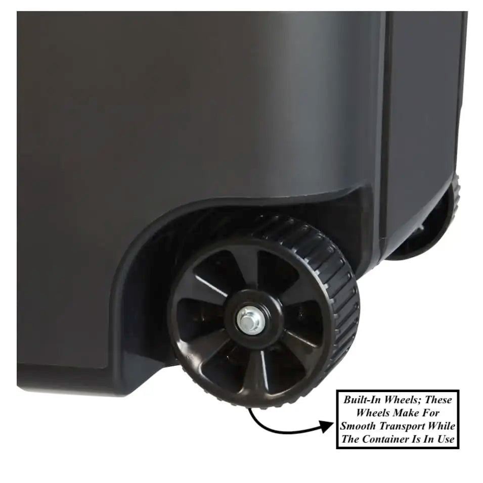 - Built-in rugged wheels and an easy-grip handle let you roll full bins with minimal effort.