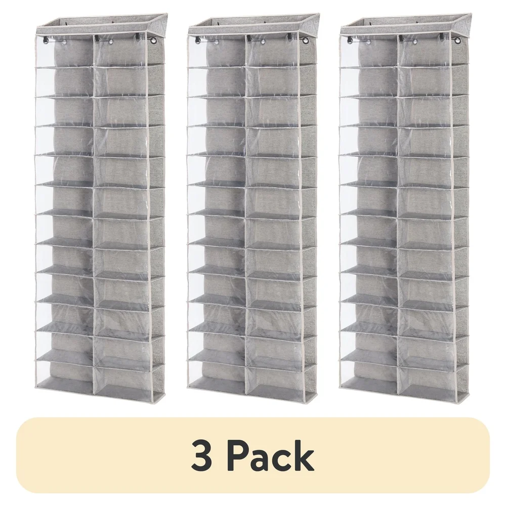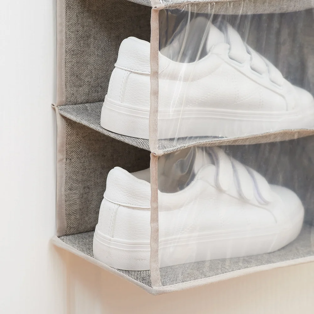 This durably crafted fabric shoe organizer comes fully assembled and ready to hang on sturdy metal hooks and is perfect for bedroom, closet, and other doors, or can be hung securely off any closet rod. The organizer features 24 shelves behind clear plastic to make storing, protecting, and identifying up to 12 pairs of your favorite footwear easy and features an open top shelf for even more storage.