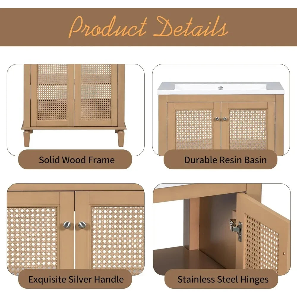 Boho Bathroom Vanity With Sink Rattan Front Panels Drawer