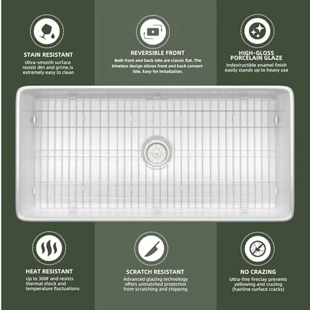 EASY MAINTAINCE MODERN KITCHEN SINK: The smooth and non-porous surface of the fireclay sink makes it easy to clean and maintain. Our white farmhouse sink is designed with a radius of R20 easy to clean corners, the ultra-smooth surface is easy to wipe. Just simply clean this fireclay kitchen sink with soapy water, food wastes, and liquid that will easily go off the surface of this undermount kitchen sink 30 inches. Keep the farmhouse-style kitchen sink single bowl look pristine. The elegant glossy white color makes this dish basin for the kitchen sink the perfect addition to your kitchen for a lasting impression.