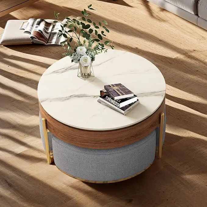 32 "coffee table set, round marble coffee table with storage and nested footstool, modern functional living room furniture set