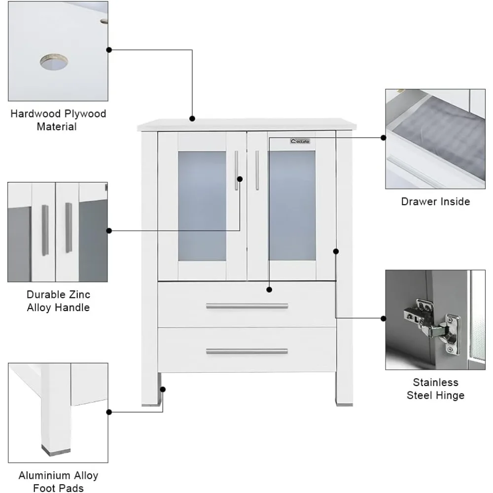 - SPACE SAVING: Small body includes maximized storage. 5 drawers, more convenient and flexible for you to use. 2 doors with frosted glass, not only can store tall items, but also make your bathroom neat
