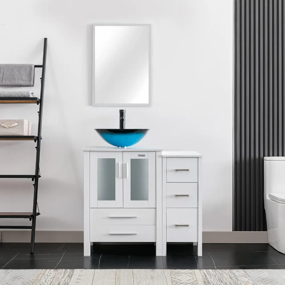 36" Modern Bathroom Vanity Sink Combo White W/Small Side Cabinet Turquoise Square Glass Vessel Sink & Water Save Faucet & Pop U