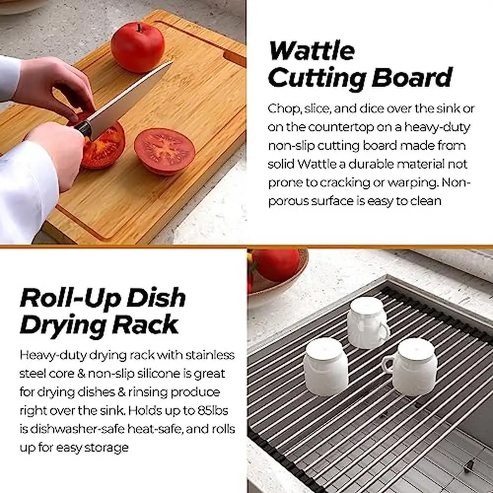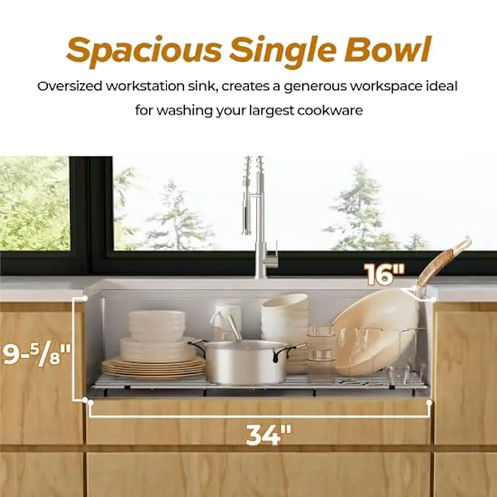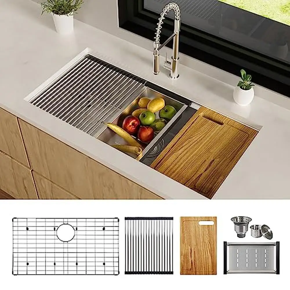 KITCHEN SINK KIT: Product suite includes: Sink x 1, wooden cutting board x 1, dish grid x 1, strainer x 1, drain cover x 1, roll-up dish drying rack x 1, stainless steel colander x 1. This 36 inch stainless single bowl workstation sink provides tracks for cutting boards and other accessories, thereby bringing you more space.