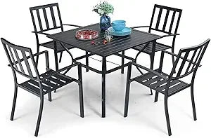 This outdoor dining set is built to endure year-round use while keeping a clean, refined look. The weather-resistant finish and rust-proof construction ensure longevity with minimal care. The square table’s umbrella hole lets you enjoy shade on hot days, while the stackable chairs save space when you’re not hosting. With comfortable seating for four and a sturdy, stable design, it’s an ideal centerpiece for family meals, gatherings, or quiet alfresco dining in your outdoor space.