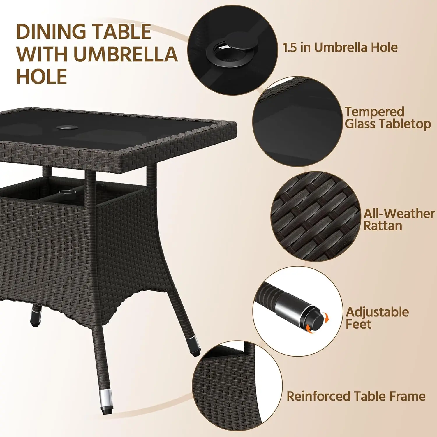 5-Piece Patio Furniture Set, Outdoor Rattan 4 Dining Chairs & Tempered Glass Table with Umbrella Hole, for Garden Backyard Deck