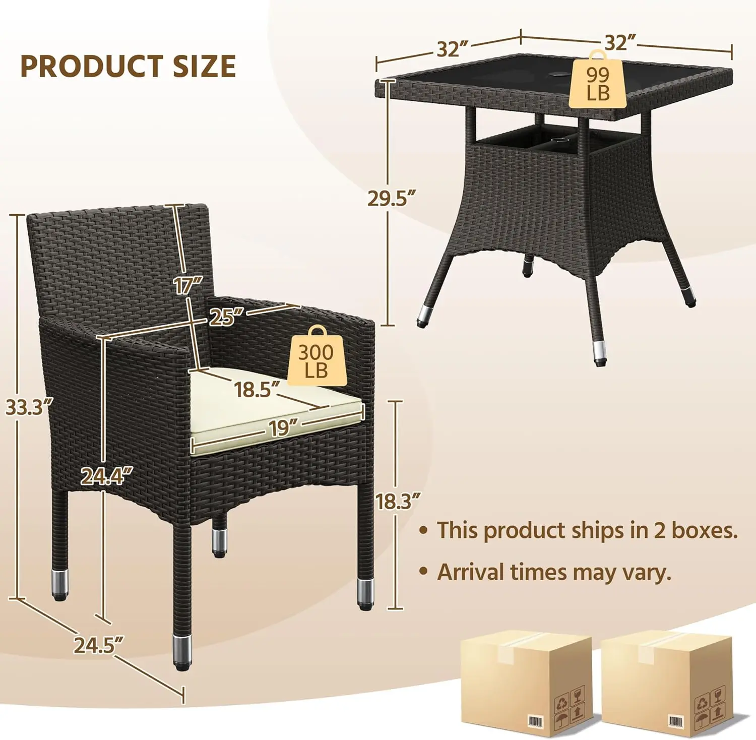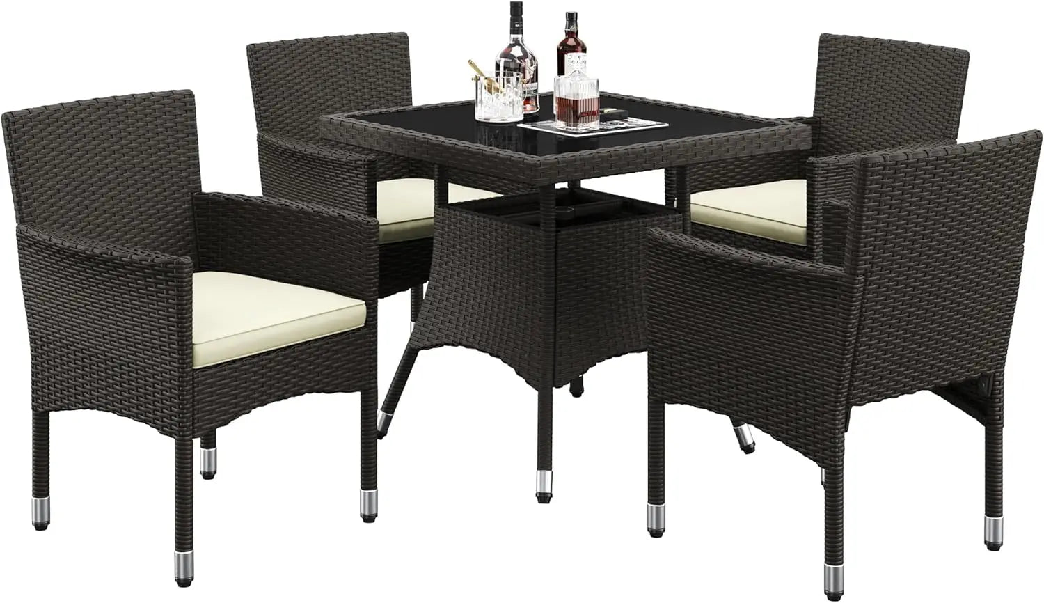 5-Piece Patio Furniture Set, Outdoor Rattan 4 Dining Chairs & Tempered Glass Table with Umbrella Hole, for Garden Backyard Deck Balcony, Brown/Beige