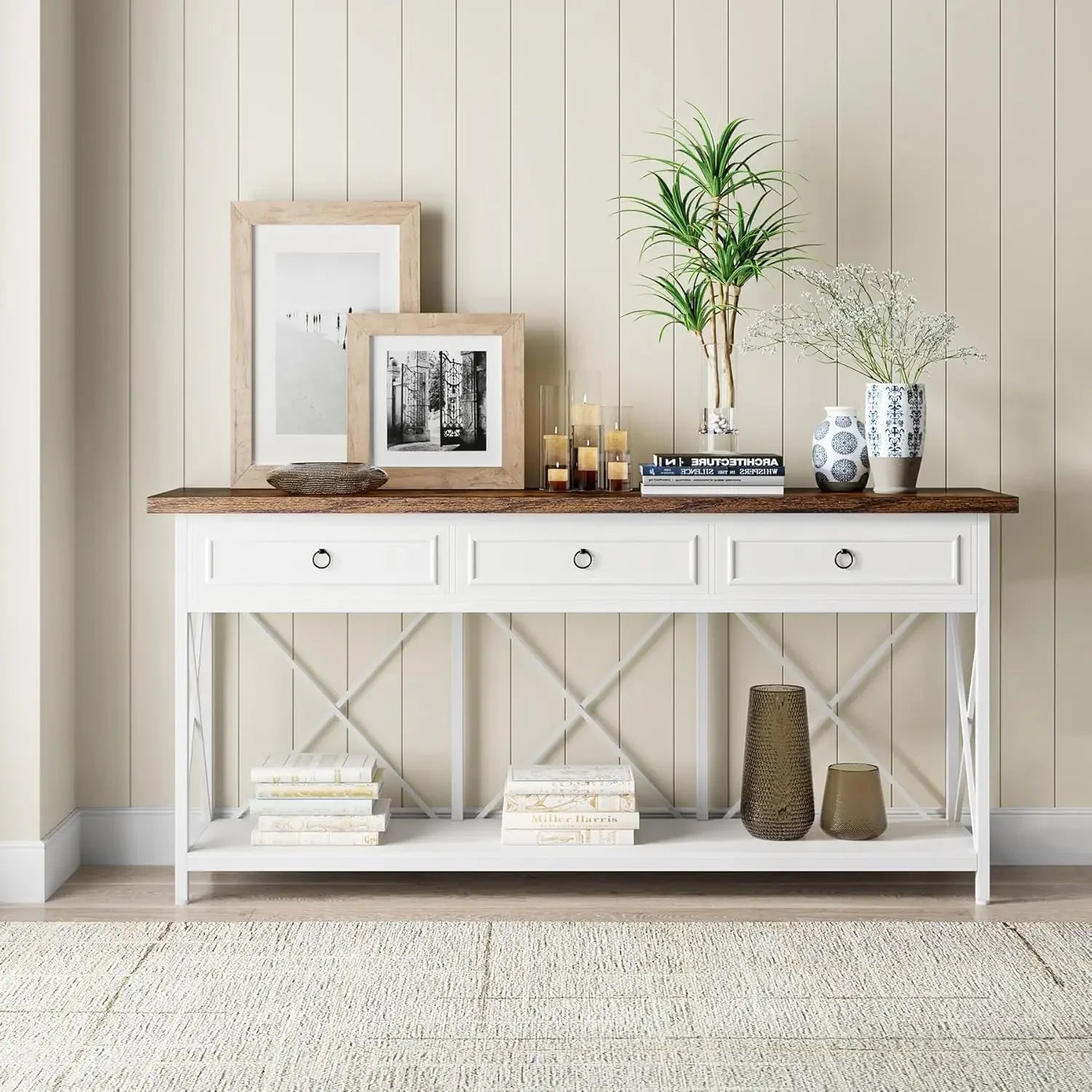 XMSJ Farmhouse Console Table With 3 Drawers And Entryway Storage Shelf