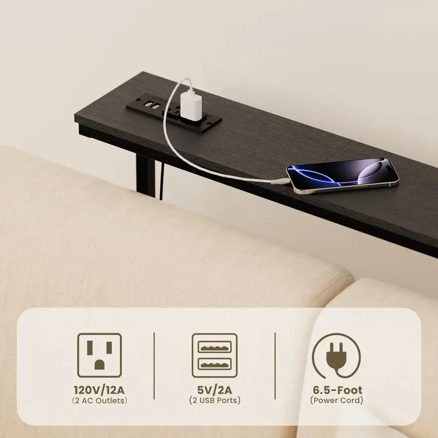 - Built-in power: two outlets and two USB ports wired for easy charging of phones, tablets, and laptops, with an interchangeable outlet position to suit your layout.
