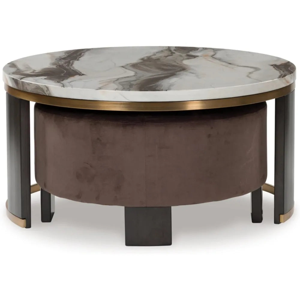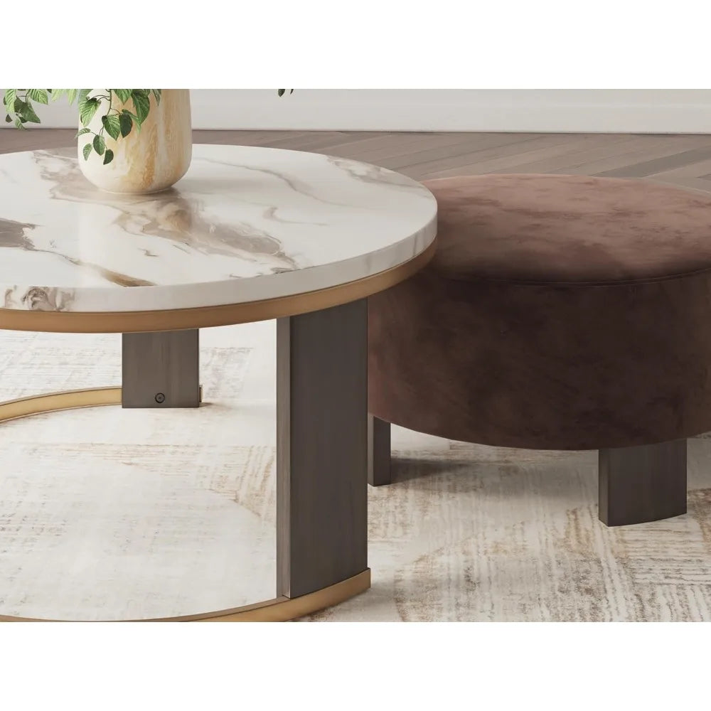 Elevate your living space with faux marble nesting coffee tables and a velvet ottoman set—timeless brass accents, warm walnut legs, and adaptable surfaces for everyday living.
