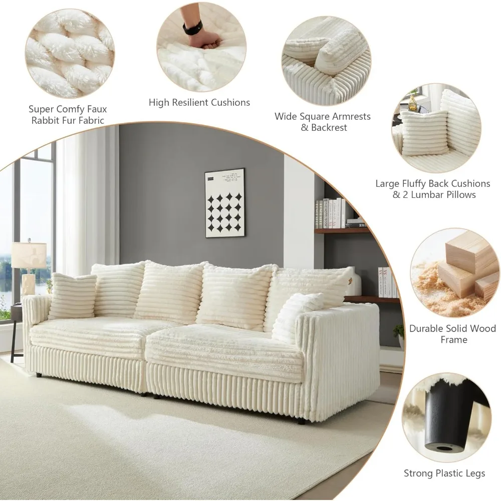 - 【Premium Faux Rabbit Fur Fabric】: About 104.3 inch in length,our corduroy 4 seater cloud sofas for living room are upholstered with premium faux rabbit fur corduroy fabric,which is so soft and comfortable on the touch,meanwhile looks very elegant,these fluffy corduroy cloud couches make a very warm and welcoming statement for you living room,bedroom,apartment,studio or office.