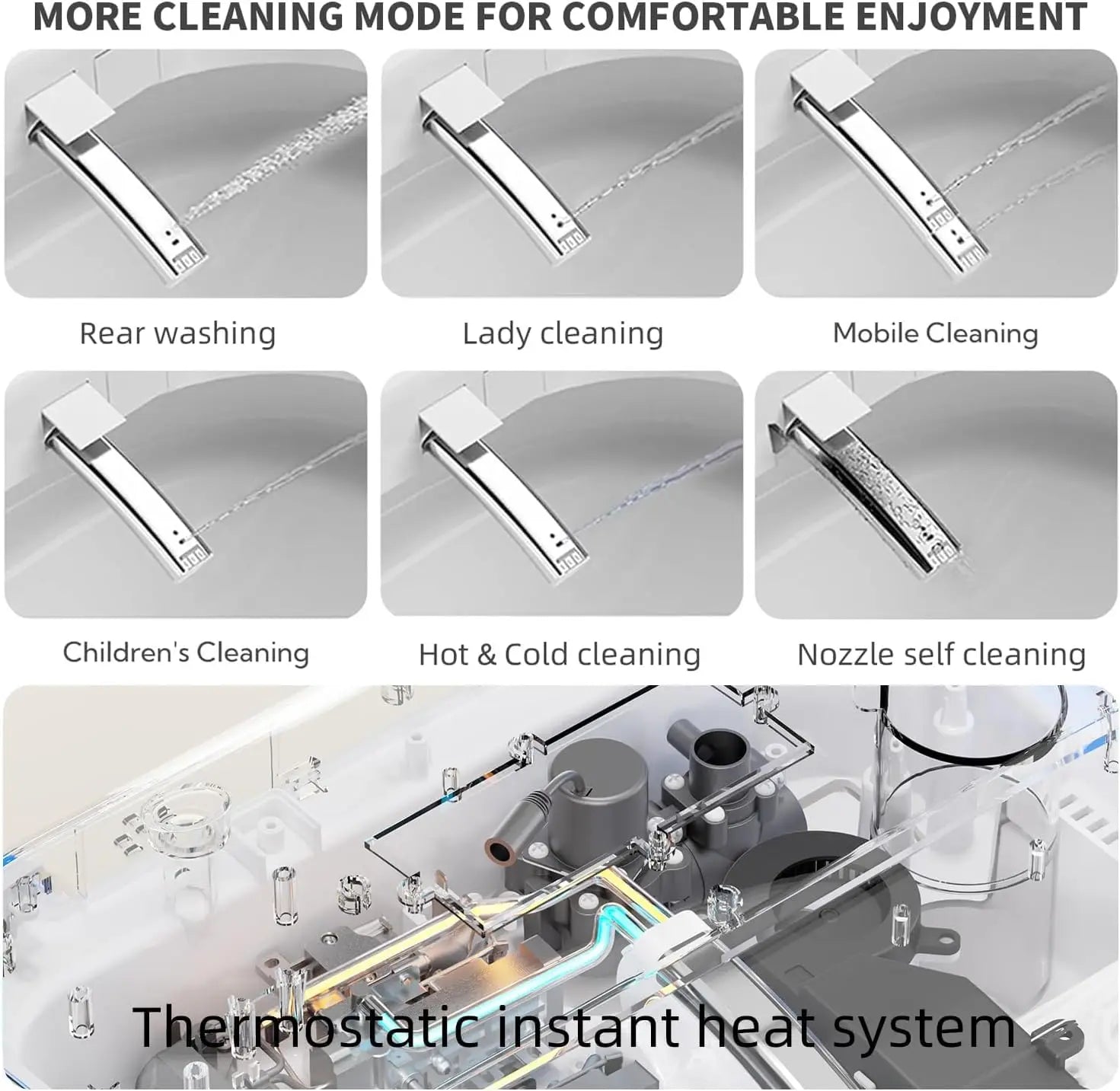 - Instant warm-water bidet with adjustable temperature, six levels of heat, oscillating nozzle, and posterior or feminine settings delivers a thorough, eco-friendly cleanse for you.