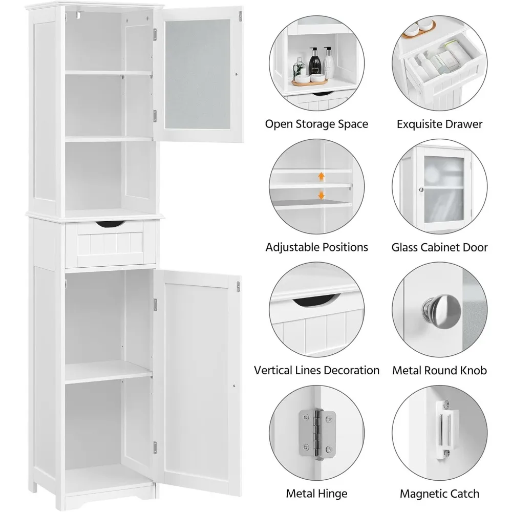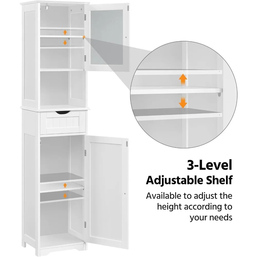 This storage cabinet is a versatile piece designed to cater to your daily storage needs. It features a combination of open and concealed storage spaces. The enclosed section of the cabinet is equipped with a tempered glass door, which helps keep your belongings protected from dust. The open middle compartment offers easy access to your frequently used items. The cabinet includes two sections with doors, each containing adjustable shelves that can be removed or repositioned to accommodate various items. This flexibility allows you to store essentials such as shampoo, towels, and shower gel according to your preferences. Constructed from high-quality MDF board with a waterproof finish, this bathroom stand is both durable and stylish. It boasts refined details and is designed for easy cleaning and maintenance. An anti-tipping device is included for enhanced stability and safety. The cabinet comes in a white color and is made from materials including MDF, tempered glass, and metal hardware. Its assembled dimensions are 16 inches in length, 12 inches in width, and 67 inches in height. The inner drawer measures 12.2 inches in length, 9.4 inches in width, and 4.4 inches in height. The middle open compartment has dimensions of 13.4 inches in length, 11 inches in width, and 10 inches in height. The maximum weight capacity for the shelves is 21 pounds, while the drawers can support up to 8.8 pounds. Assembly is straightforward, with numbered parts and clear instructions to guide you through the process. The task can be completed with ease, and the efficiency can be doubled if two people work together on the assembly. This cabinet is an effortless way to refresh your living space.