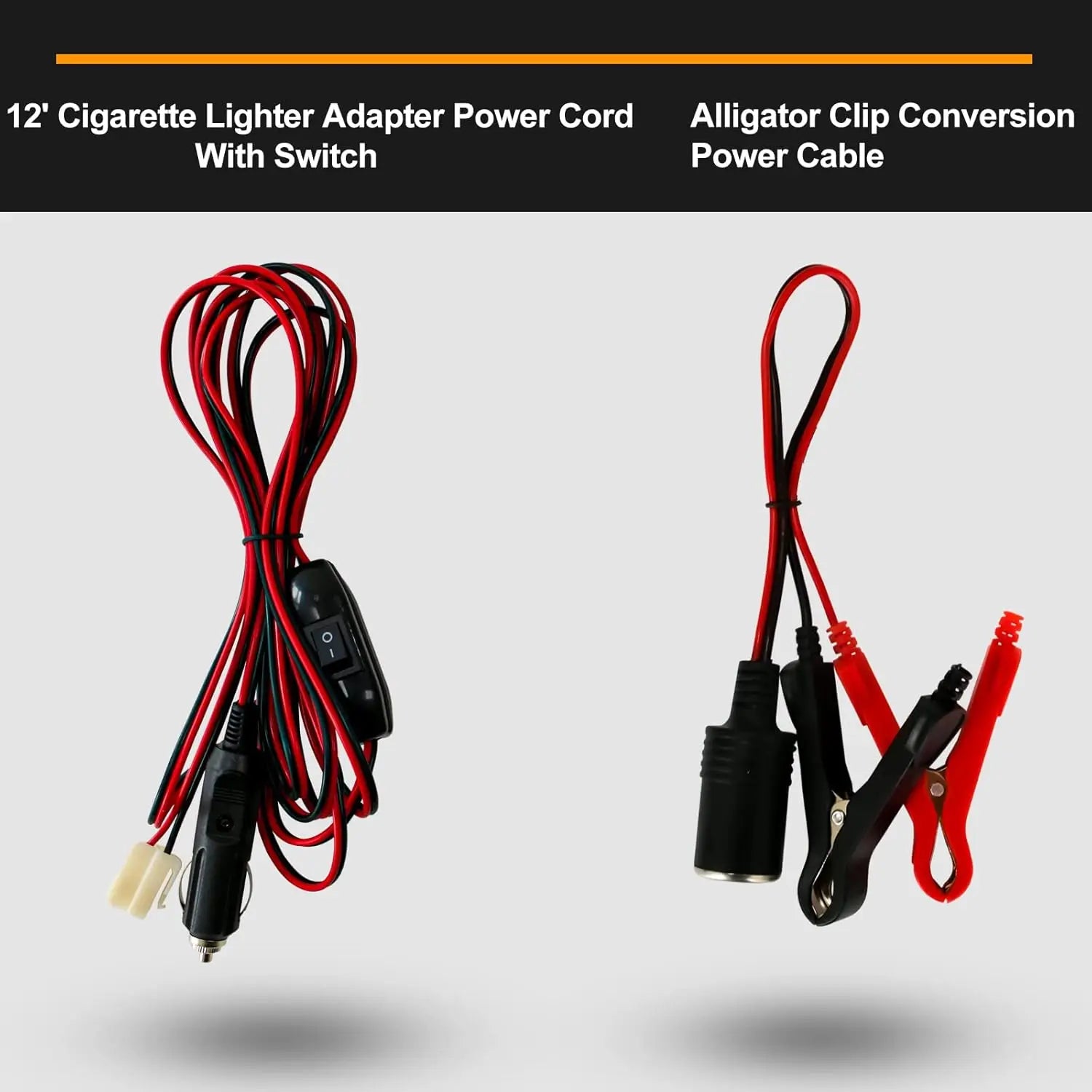 - Includes 11.5' cigarette lighter power cable with switch, 11.8' alligator clip cable, 7.5' temperature-resistant fuel line, two debris filters, one adjustable-width retaining clip, and one standard fuel funnel.