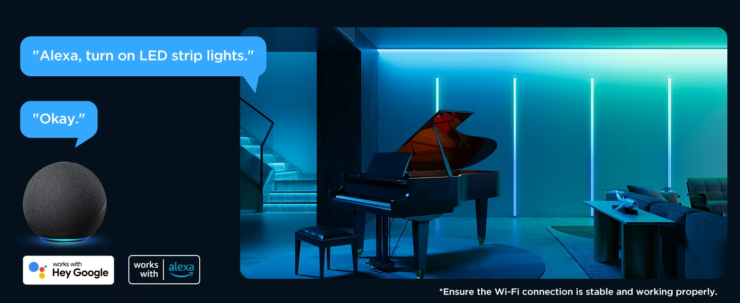 Smart and Easy Control: Adjust brightness, scene modes, timers, and color temperature in Govee Home App via Wi-Fi and Bluetooth.This Govee LED lighting strip can also be voice-controlled after pairing with Alexa or Google Assistant.