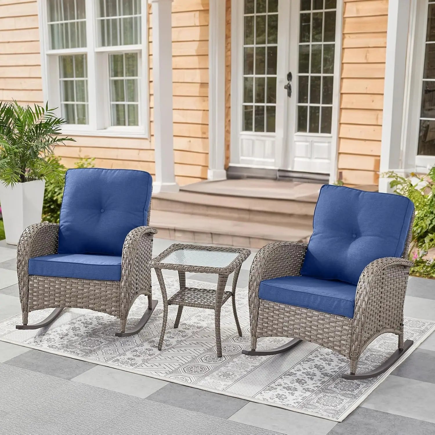 Experience relaxed outdoor comfort with the High-Back Outdoor Wicker Rocking Chair Set—a 3-piece patio solution designed for porches, balconies, and sunlit nooks. This set includes two high-back rocking chairs and a glass-topped side table, pairing timeless wicker styling with modern durability.