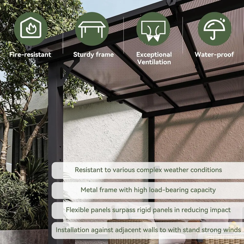 【Premium Material & Excellent Load-bearing】The top of the pergola has a remarkable load bearing of 55 lbs/㎡, which is resistant to various complex weather conditions as long as it is wall-mounted with expansion bolts. Besides, the polycarbonate top is able to reflect 99% of UV rays and thus provide UV protection. Besides, the maximum wind resistant grade is 7(31-38mph) and the maximum snow loading depth is 4 inches after you install the ground nails and expansion bolts.