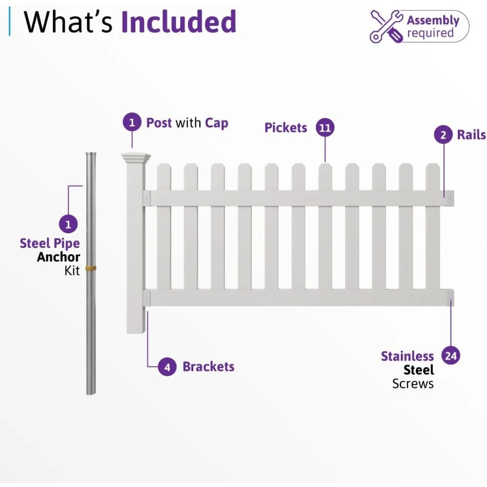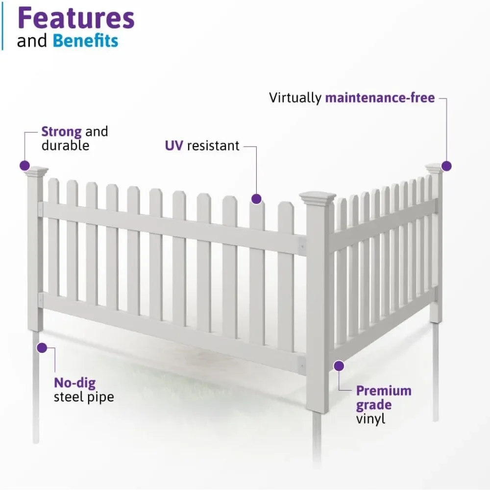 HOME.3ft H x 6ft W (1 Panel + 1 Post) No Dig Zippity Newport Fence Kit, White Vinyl Picket Fence