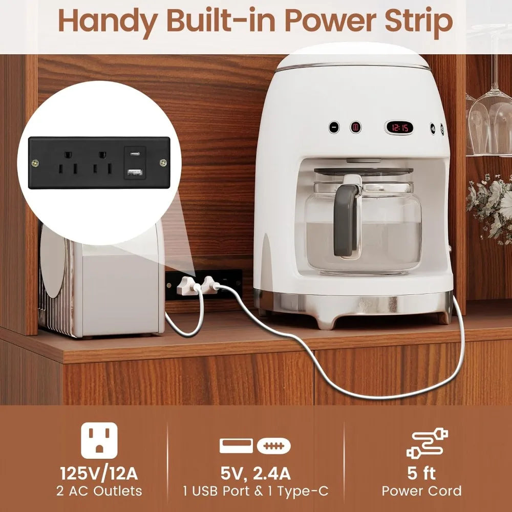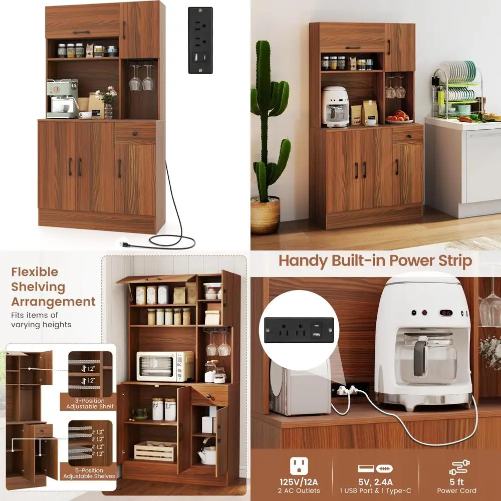 This kitchen pantry cabinet offers ample storage with a large countertop, an open shelf, a deep drawer, and multiple cabinets, perfect for organizing dinnerware, cookware, and small appliances. It also features a wine glass holder that can securely store 4-6 glasses for easy access. The cabinet comes with a built-in power strip that includes 2 AC outlets, 1 USB port, and 1 Type-C port, making it convenient to charge multiple electronics such as microwaves and coffee makers. The hutch cabinet has a 3-position adjustable shelf in the top single-door cabinet and two 5-position shelves in the lower cabinets, allowing for flexible storage to accommodate various item sizes. Made from thick boards, the freestanding buffet cupboard is robust and stable, with 2 anti-tipping kits included to prevent wobbling or tipping over when loaded with items. This tall pantry cabinet is versatile and can serve as a buffet cabinet in the dining room, a kitchen cupboard, or a coffee bar station in the living room, fitting seamlessly with any room style.