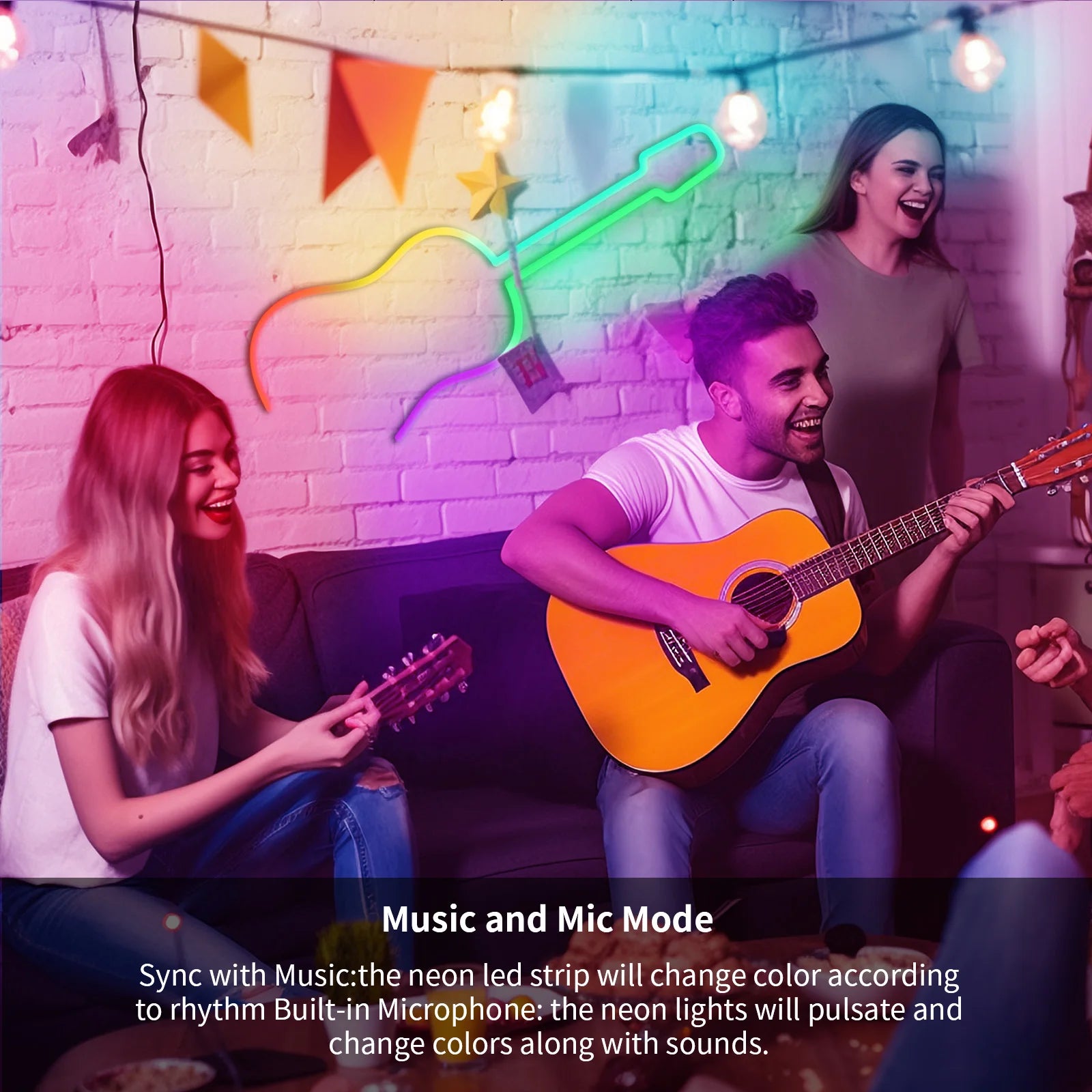 Illuminate your space with vibrant, programmable RGBIC neon LED strip lights that morph colors, scenes, and mood at the touch of your Bluetooth RF remote.