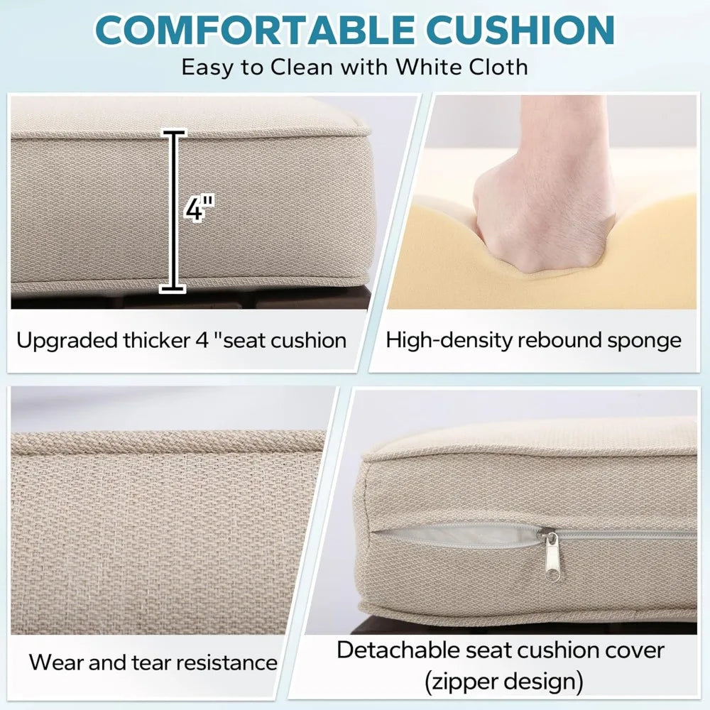 - All-weather cushions: Beige fabric cushions with high-density foam stay comfortable year round; cushions are detachable and washable for easy care. Note: cushions may fluff up after unpacking; water-repellent fabric helps reduce water absorption but isn't fully waterproof—bring indoors during heavy rain.