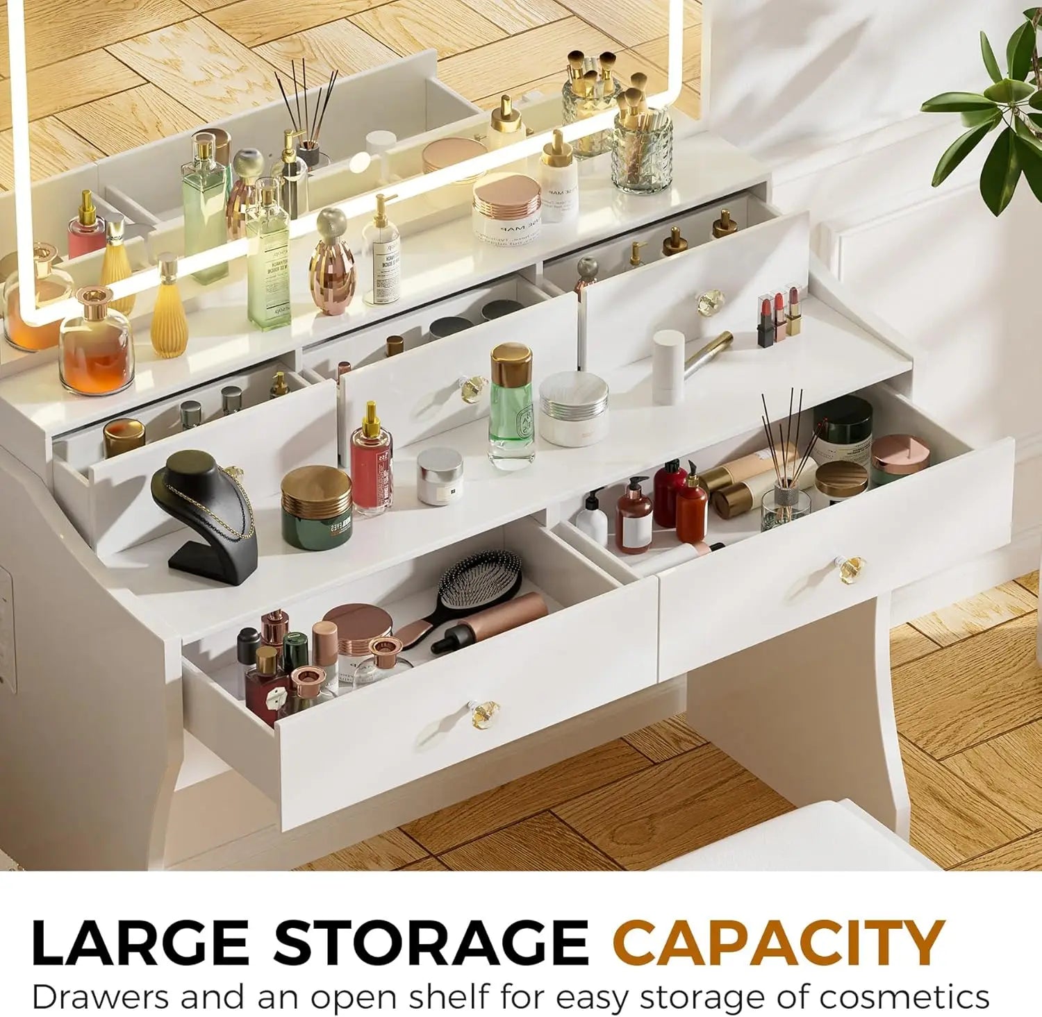 Elevate your beauty routine with this XMSJ makeup vanity, a modern pearl-white centerpiece that blends expansive lighting, generous storage, and a practical charging station for everyday use.