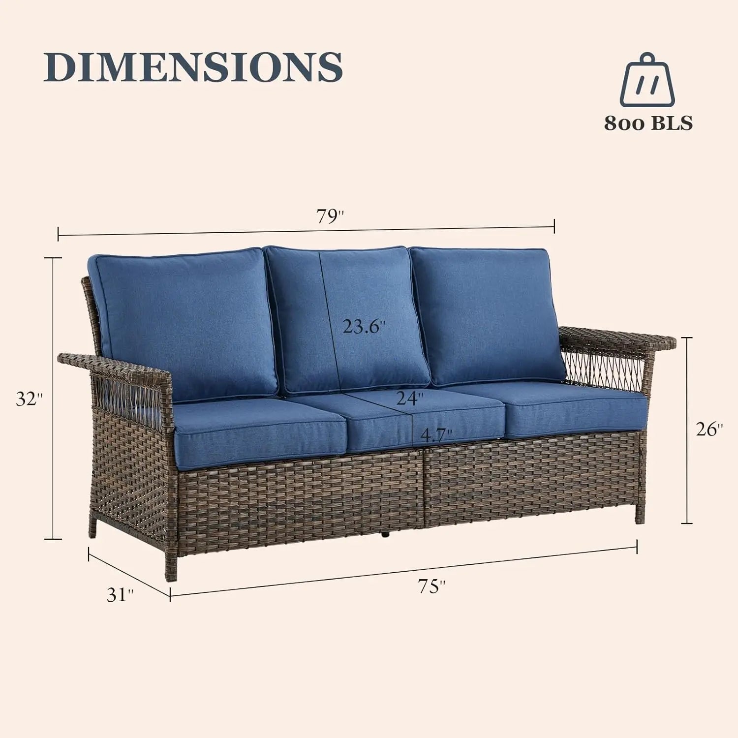 - COMFORTABLE SEATING: Enjoy cozy seating with the wicker sofa and plush blue cushions, perfect for relaxing outdoors or entertaining guests in style.