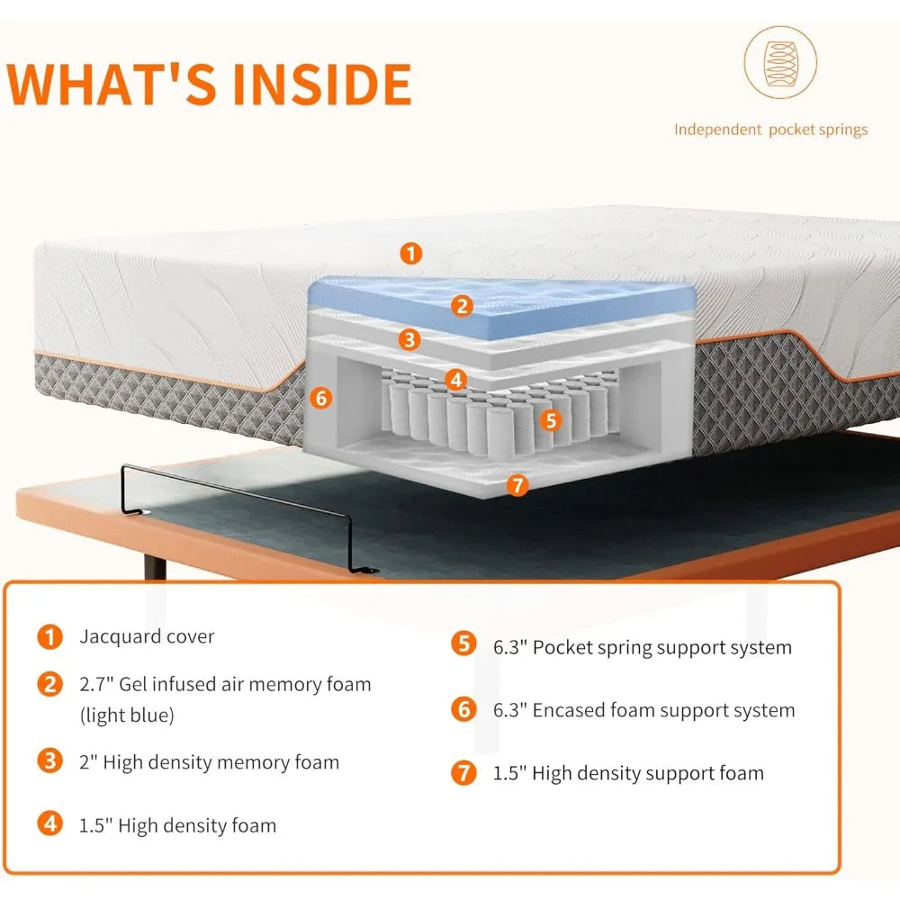 - Personalized comfort on demand: The adjustable bed frame lets you find your ideal position for reading, relaxing, or sleep, while the gel memory foam mattress contours to your body for optimal alignment.