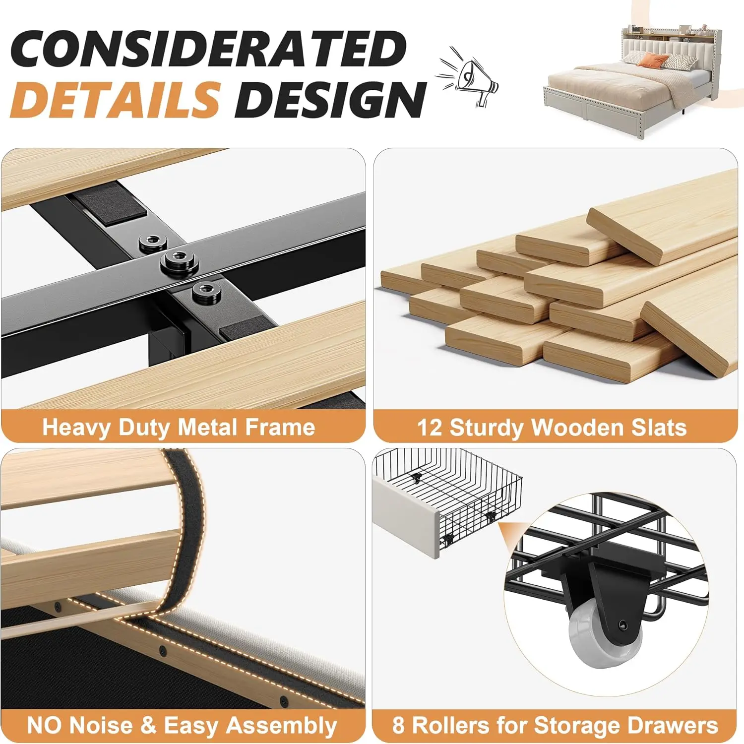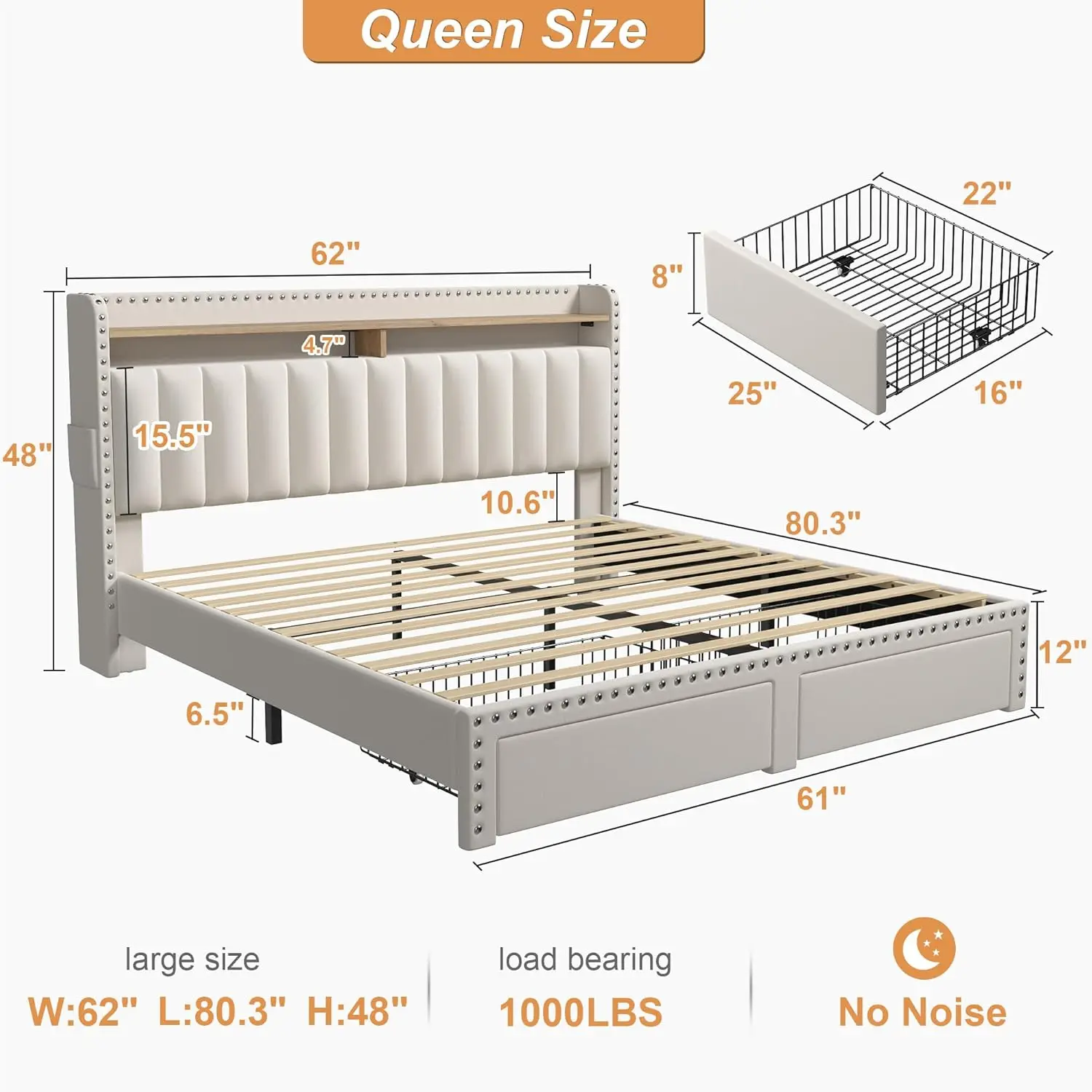 Queen Bed Frame with Headboard and Storage, Upholstered Queen Bed Frame with Storage