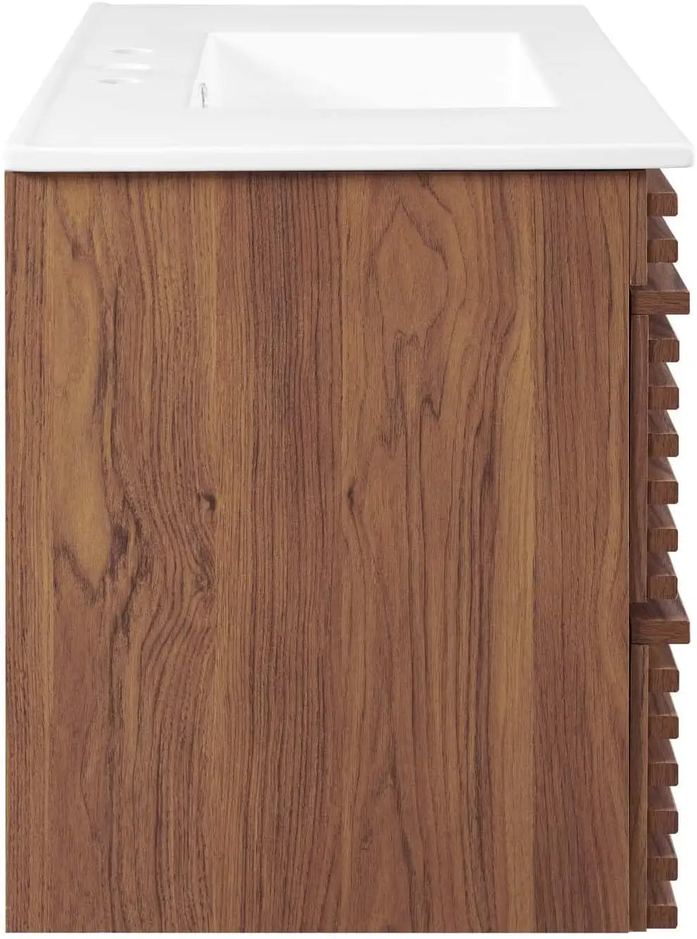 - Space-saving design: 36-inch wall-mount vanity in Walnut/White keeps your sink area clear and makes cleaning effortless, while the floating silhouette suits tight spaces.