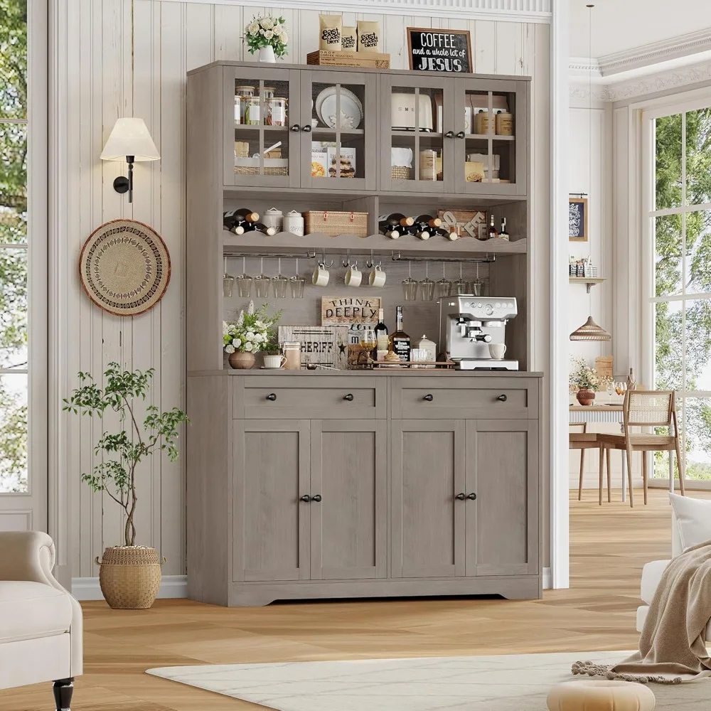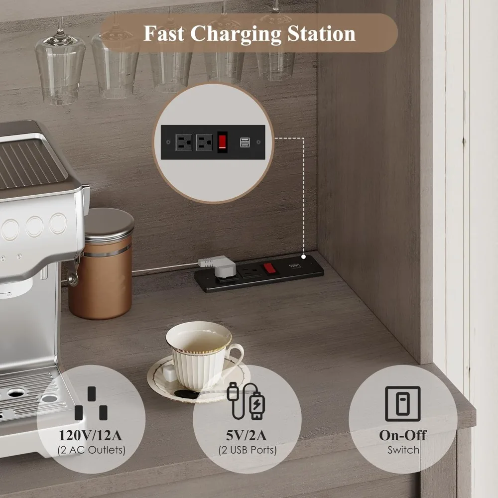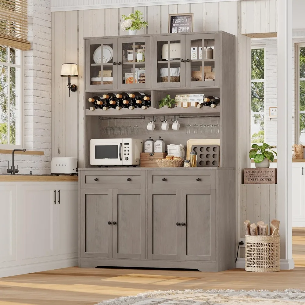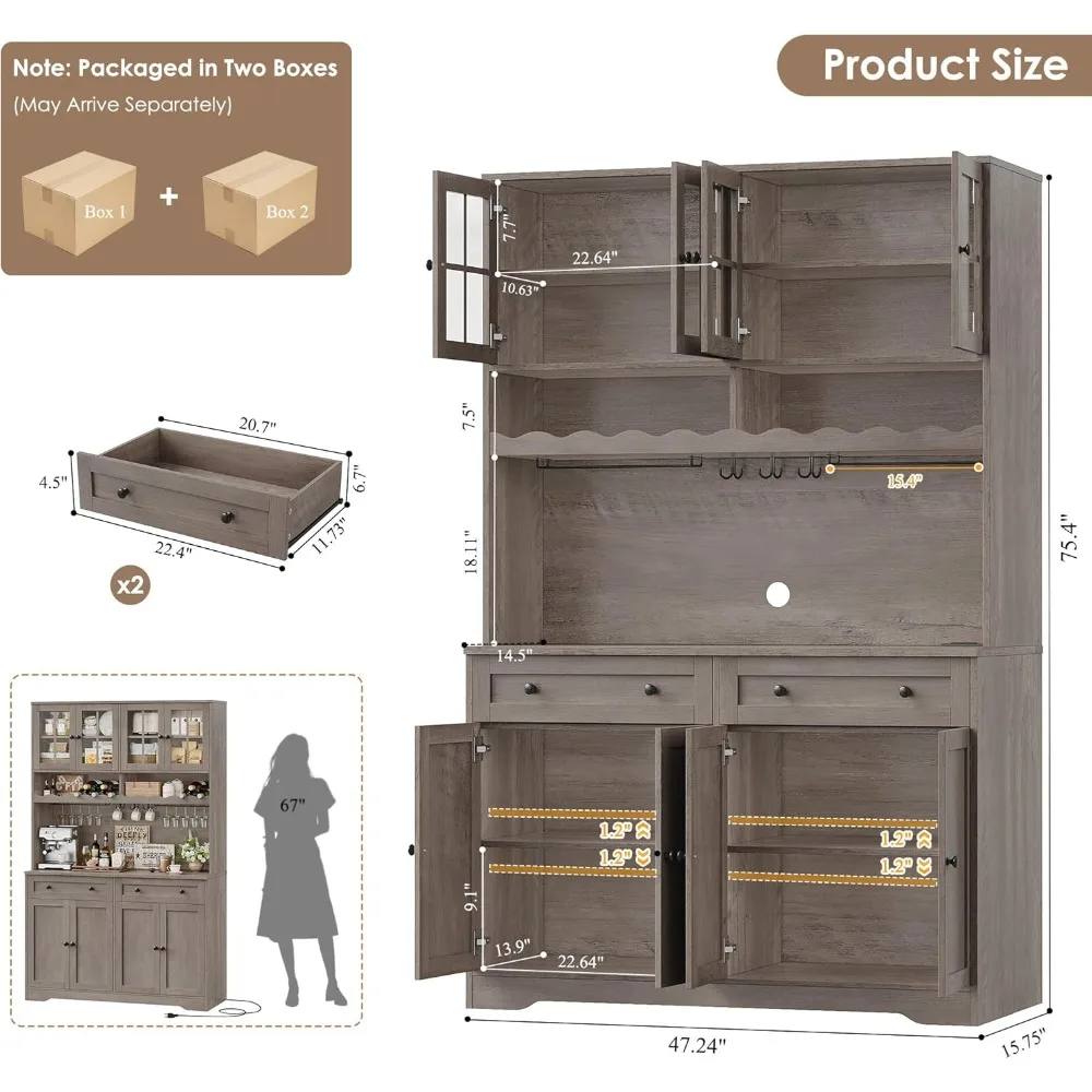 This kitchen pantry offers ample storage solutions with its practical design and modern aesthetic. It features 4 glass doors, curved wine racks, mug hooks, and stemware racks for easy access to items. The spacious countertop can accommodate microwaves and coffee makers, while the two deep drawers and 4-door cabinet provide ample storage. The cabinet also includes a built-in outlet for device charging and a wire hole for wire organization. The sleek finish and tempered glass doors create a minimalist elegance that complements various decor styles. This versatile pantry can serve as a kitchen cabinet, microwave stand, wine cabinet, or storage cabinet, blending functionality with modern design to enhance any room's utility and style. Crafted from premium engineered wood with reinforced construction, this pantry ensures lasting durability and stability for reliable use. The overall dimensions are 15.75”D x 47.24”W x 75.4”H.